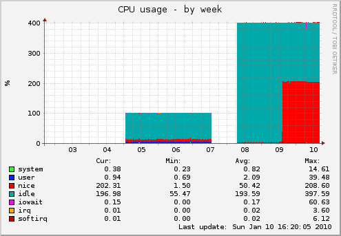 Eip finalmente pude cambiar mi NAS de un K6 III@550 y 256MB de 34watts por un Atom n330 Dual @1.6ghz con 1GB de ram, estoy pensando que para maquinas viejas es un remplazo excelente el Mini-ITX D945GCLF2D de Intel, claro que notar en la instalación un par de bugs del BIOS y que por alguna peregrina razón el netinstall de debian me dejo todo para sdb cuando estaba instalando en sda (cosa que aun no se si fue culpa del instalador o de unetbootin) en fin que tal cual el gabinete coolermaster + la D945GCL2D hacen una combinación excelente, eventualmente voy a tener que cambiar de PSU si quiero añadir mas SATAS y claro también poner la tarjeta controladora SATA puesto que solo trae dos puertos (quiero tener 6 pero eso puede hacerse durante el año), el plan es migrar de los IDE a SATA.